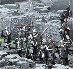 The Basic GameNovember 2001 Long awaited by Games Workshop Fans and Tabletop-players all around the world, Games Workshop released their new tabletop game "The Fellowship of the Ring" at the beginning of November 2001, just a few weeks before the first part of the movie-triology was coming into cinemas all around the globe. Based on the famous Lord of the Rings books by J.R.R. Tolkien, Games Workshop left the Warhammer world and adapted their new game to a different background story. Unlike Warhammer Fantasy, players of the new game do not move huge formations of troops over the battlefield, but instead all battles are played on a man-to-man level, leaving the players to move each figure individually. In essence, this leads to small, skirmishing battles, but as the rules demonstrate, even large battles with up to 300 (!) models involved can be played. At the beginning of the game, the players agree on a scenario which they want to play. The rulebook includes a selection of 8 different scenarios of which 6 are based on the story of The Fellowship of the Ring whereas the two others are taken from an earlier age of Middle Earth, the time of The Last Alliance. Usually a scenario dictates which miniatures / characters the good and the evil player should use, but if they do not want to play a scenario close to the original story-line they can also build up forces of their own. For this purpose, they can agree on a certain number of army-points, and each player then can chose troops and equipment up to a maximum of his army-points. To allow free army-building, army-lists featuring all troops available to the players are included in the rulebook. The good player basically can chose from the characters of the Fellowship, additional characters like Elrond, Bilbo, Galadriel, Gwaihir the Eagle-Lord or Gil-Galad, and standard foot soldiers equipped with sword, spear or bow from Gondor, the Wood Elves or the High Elves. The evil player on the other hand can include all 9 Ringwraiths, Saruman, the Balrog, a Cave Troll and a number of different Orc and Goblin forces. Additionally, players can spend some points to equip their Hero-Characters with certain types of extra-equipment like special swords or Elven Cloaks, once again following closely the storyline of the book. Once all players have chosen their troops and have placed them on the battlefield following the rules set out for their scenario, the battle will begin. At the beginning of each turn, both players will roll dice to find out which player has the initiative that turn, allowing the player with the higher result to move and act first. Then, the game is divided into different phases in which always the player with the initiative is allowed to act first. In the Movement Phase, players are allowed to move their figures up to their maximum range (depending on the characteristics of each character or troop-type). Movement can be along simple plains, but also rules for moving through difficult terrain, jumping barriers, climbing mountains, crawling on the ground and even movement on horse are included, thus offering a variety of movement options to players who want to make advantageous use of the terrain on the battlefield. After movement, the next phase is for Archery, and now the troops equipped with bows or other ranged weapons will have a try to inflict some damage on the opposing troops. A simple roll of a dice is required to find out whether a unit has hit an enemy, and then another roll of a dice (modified by the attacker's strength and the defender's defense characteristics) will determine whether the hit has caused damage to the unit which was hit. Units which possess only one Life-point (most units with the exception of characters) will be directly removed from play as casualties. After the ranges combat is over, all units which are in contact with enemy units (i.e. the miniature's bases are touching each other) are allowed to fight in the Melee Phase. Once again the questions whether a unit hits and whether it causes damage are resolved by rolls of the dice, but many optional rules may have influence on the outcome of a close combat. Thus, a unit may defend a barrier, or it may be attacked by more then one enemy, making it quite hard for the specific unit to escape his doom. After this phase, if no player has fulfilled the victory conditions set out in the chosen scenario, the game will continue with the Initiative Phase of a new turn. In addition to these rules, the players may decide to include a set of advanced rules which will allow them to play the game in much more depth. One element which will be introduced into the game is Troop-Psychology, making it possible that troops cut off on the battlefield or facing a fearsome enemy will not attack but instead turn on their heels and flee - with a quite devastating result for an orderly line of attack. Even more story-elements are introduced through the use of characters (Heroes), depicting famous personalities from the story of the Lord of the Rings. With their special attributes like Heroism or Willpower the Characters often will have a decisive influence on the game, and special attributes like the ability to use Magic can have devastating effects on a badly organised enemy. Even more detail is added by the use of different types of weapons, and all these advanced rules together allow the game to become an in-depth adaption of battles and skirmished based on the Lord of the Rings. ![]() When trying to evaluate a gaming product as big as Games Workshop's new Lord of the Rings branch, a review cannot simply stop with an evaluation of the rules but has to move further and have a look at some other influential factors. Having said this, it seems nonetheless advisable to start with a comment on the rules, and here it can be said that Games Workshop did rather well with the development of them. Unlike former Games Workshop products, the designers of the new game avoided a "flooding" of playe