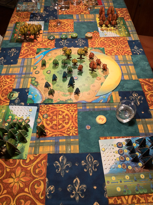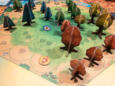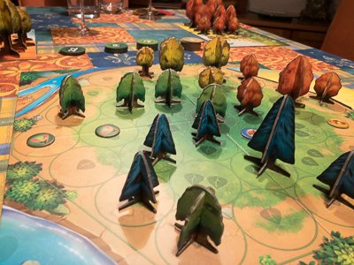 Each player has his own player board on which he places his trees in three different seizes. Additionally he gets some new seeds to grow new trees and a light point tracker, the “currency” of the game. The seeds and trees are our supply for the game and must be purchased for activation. Depending on their position of the board, each tree has its own value (the bigger the tree the more expensive it is) and a player must subtract the indicated light points form the available using the light point tracker on his board. But what do we do with these activated elements? First of all they are moved next to the board, to the available area.