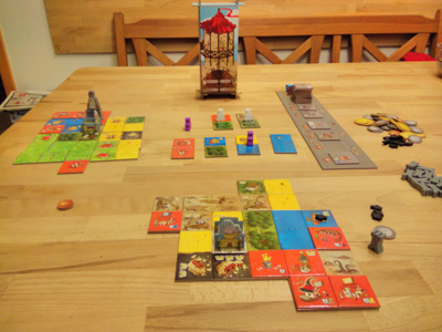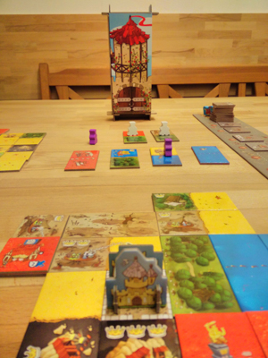 ![]() During the game, they try to expand this land by a clever and easy to learn card drafting and tile placement mechanism. At the beginning of each round, new domino tiles are drawn randomly from a nice three-dimensional tower. All new tiles are placed on the table in ascending order with their numbered side face-up, so that in the end, there are two columns, each with as many landscape tiles as there are players. After that, all tiles are flipped and revealed. To start the game, players place their Kings randomly on the revealed tiles of the left column. The topmost king begins the game by taking the domino tile his or her king stands on, adding this new landscape tile to his territory according to the connection rules. These are quite simple: at least one landscape square of the new domino has to fit to a landscape square of the domino where the player wants to place it (the starting domino is considered as a wild domino, every terrain can be connected to this tile). Afterwards, the player chooses a new domino tile in the right column that is still in the middle of the table, and places the king on it. ![]() After all players have carried out these two actions, a new column of landscape tiles is drawn from the tower. The next round starts by the topmost King of the new line on the left side again. So, each round the players have to decide, if they want to get the most compatible domino for their territory or if it is better to be the first player in the next round. Only sometimes, both aims fall on the same landscape tile. The aim of the game is to connect as many domino tiles with the same landscape terrain as possible in a 5x5 grid territory (7x7 in a two player game). But that's not enough: a territory without a crown gives the players no winning points. So every player tries to get the best landscape tiles to connect and to integrate winning points with crowns in it. The player with the most points is the winner. Up to now, the game feels a little bit like a mixture between Carcassonne and the name-giving good old Domino game. But Queendomino is more complex than Kingdomino. And so, it also introduces a lot of different types of buildings that can be aquired from a building deck, accessible for all players. These buildings increase the opportunities to score, and makes the game much more tactical. Black knights, towers, a queen and a dragon, all with their ownassociated actions and possibilities, are only a few examples. For example: When a player erects a building, this could end up in immediate effects like getting a knight or a tower, permanent effects like increasing your income by raising taxes, or just victory points at the end of the game. As a result, a player can decide, whether he wants to invest some money to buy a building in order to get better access to resources or if he prefers to go for benefits he can use to improve his positions. Furthermore, the players may react to the actions of the other players by choosing a corresponding strategy. ![]() Playing Kingdomino means that players can decide which domino tile they choose and which landscape they want to develop. Playing Queendomino on the other hand let them determine on which additional aim they will concentrate on. It might be a good strategy to aquire the most towers by erecting the corresponding buildings, because in that case the Queen joins the player's kingdom and lowers the building cost by one. And at the end of the game, she counts as one extra crown. All those additional game actions of Queendomino are optional, whereas the initial actions, especially adding the landscape tiles and choosing a new domino are mandatory. From my point of view, Queendomino brings the playing mechanism to a higher level and increases the replayability of the game. There is a broader range of opportunities to build your territory and gain winning points. Although the rules are a little more complex, it is still a family game. It was great fun playing Queendomino with my 8 year old daughter in a two player game. However, playing the game with some grown-up and experienced players tells another story of the game. Last but not least, Queendomino is a standalone game, but it can also be used as an expansion for Kingdomino. | ||