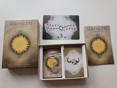 ![]() Each round of the game begins with the drawing of an event card, all of them with negative effects for the players. In the one round it may be forbidden to take cards from one of the animal stacks, in another round players will be forced to add a scorpion card to their discard pile. Those scorpions are not really useful, because they kind of clog our deck and – if we cannot get rid of them – force us to move a marker on a competition track - that lies between the two players - one step towards the opponent. This competition track is balanced at the start of the game, but each step the marker is nearer to a player results in one victory point for this player at the end of the game. Before we have a closer look at the victory conditions, let us see what we can do with the animal cards: Each card in the game has two functions when it is in our hand. Either you use one of the two effects of the card or you use the card for “paying activation” costs for an effect of another card you want to use. The eagle, for example, can be used to draw a new card from your deck as a free action. Alternatively you could expend one of your other hand cards to use the eagle for searching your deck or discard pile for a scorpion (with the result that the scorpion will be eaten by the eagle and can be returned to the supply). ![]() Another example: Lions are very impressive animals, both in reality as in the game. By expending four other cards as the activation costs (yes, that's really an expensive action, considering that you start each turn with only five cards), the lion can be laid to the savannah, next to the competition track. Lions at this position are no longer part of your deck, but at the end of the game, the player with more lions in the savannah gains 3 extra victory points. Of course there is also an animal to scare away lions from your opponent again (the elephant). Alternatively a lion can be used to move the marker on the competition track one step towards you. Unfortunately you also have to add a carcass to your discard pile, another useless card (unless you can use the effect of a hyena in a later turn) that will produce a loss of 2 victory points at the end of the game for the player with the most carcasses in his deck. I could go on with monkeys, giraffes and lizards. But I think you already have a rough idea and can see that the animals are very different. Indeed it will take more than one game to fully internalize the various effects of the cards and to find a strategy to win the game. But in contrast to a lot of other deck-building games finding a strategy is not enough in Serengeti – A race for Life. The reason for this is that at the end all animal types are scored separately. There is exactly one victory point for each animal type for the player with the most animals in his deck. As a result, you must not only follow your own strategy, but you have to keep track which animals your opponent has already taken. One more animal is enough to get the victory point, so there is no use to collect masses of lions or eagles or antelopes. ![]() Serengeti – A race for Life is a good debut for Rogue Marechal and his HAL-13 publisher. The game seems to be well balanced, although players who know the game have considerable advantages over new players. The rules are understandable and easy to grasp. At one point or another you can see that HAL-13 still lacks the experience of a big publishers. For example it needs some time to interpret the symbols on the cards that describe the available effects. But for me this does not spoil the good overall impression of the game. I can recommend the game for players who love deck-building games, look for something beyond the mainstream and like to have a small game box you can take wherever you want. | ||