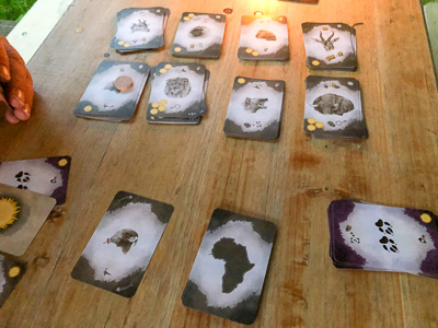 Serengeti – A race for Life is a deck-builder for two players, but one of the unusual kind. Our starting hands consists of 5 trail cards for acquiring new cards from the “market”. The market, called supply in the game, is build up by 8 different animal stacks, each containing 9 identical animals and a rock. At the setup each of these stacks is shuffled, so you do not know at which position the rock will be found. A rock prevents a player to take a new animal from this stack unless he uses a special power. Secondary five revealed rocks are also one of the three conditions for the end of the game.