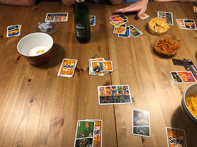 ![]() If there is a snitch, the card is taken in the hand like any other card. And from now on, the player who has drawn the snith plays against the other players. Of course, the snitch card is never played, because that would identify the snitch immediately. Instead the player with the snitch tries to sabotage schemes of the other players. Five of those schemes we have to successfully complete, before we come to the end game, the jailbreak itself. For that's our aim: to escape from prison and live a life in freedom again. Let's see how that works. A scheme is simply a card from the hand of a player that is played face up on the table. A small icon in a corner tells us how many helpers in form of cards are needed to fulfil the scheme. Now, on their turns players play exactly one card face down from their hand underneath the scheme of one of their direct neighbours, and say the name of the person on this card, or to be more precisely a prison contact, on the card. They can give hints to other player, spread rumours about the snitch and even lie about the name. Of course, this makes only sense, if the player is the snitch in person, as you will see. ![]() When there are enough helpers, another card is drawn from the supply, all cards are shuffled and then one by one the cards are revealed. The scheme is fulfilled, if there are not two cards with the same person among the cards played. Additionally there is a maximum of one backstab, an icon on part of all cards. So backstabs can also be found on the cards, but in contrary to the name of the persons, the players aren't allowed to talk about it. If the scheme was a failure, the players got caught, and the owner of the failed scheme take the scheme as an item. You see the cards are multifunctional. Items can be quite useful for the further play, for example there is an item you can play for preventing adding a random card to the completed scheme. In that case it might be possible to identify the snitch, because in case of a failure it should be one of the neighbours of the owner of the scheme (because no one else can play cards underneath that scheme and only the snitch would have an interest in that). However, if the scheme failed because of too many backstabs, it's even harder to identify the snitch, because you aren't allowed to talk about it. And even if there are two cards with the same name, it might be a mistake, because it is difficult to keep all names and cards you have played in your mind. ![]() In the end game, there is a countdown in which it might be possible to keep off the snitch from sabotage. But what might happen, if it isn't the snitch? If you play cleverly, you'll never know for sure. The Snitch is slightly more complex than The Resistance. There are more rules you have to learn (and the rulebook isn't the best, I must admit). And there are definetly more hints to identify the snitch. But still the game is balanced. Especially for the schemes that demand many helpers, it is difficult not to make a mistake. I personally find it hard to remember all those names I and the other players have played under all those schemes. It's kind of memory game in this aspect. So the snitch always has a good chance to survive. And if you are shooting the wrong player in the end game (yes you can choose one player) it should better not be the wrong one... | ||