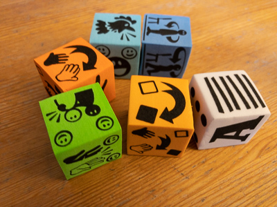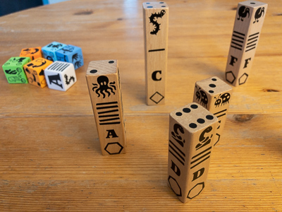Each round of the game, the six posts are set upright in the middle of the table, accessible to all players. If you are playing with smaller children, it's a good idea to position the posts nearer to these children (with shorter arms), because in the next step you have to grab a post as quickly as you can. But before we do, we have to check which post is good for us: this is determined by the roll of 2-5 dice. One die (the white one) indicates which post is the most precious one for the round. Additionally they tell us if there are any handicaps you must regard while grabbing the post. You must check quickly, because all players, including the dice roller, are allowed to grab (and only one!) immediately after the roll. Of course, the player who is quickest has the best chance to grab the post of the round. Well, if there weren't the handicaps...