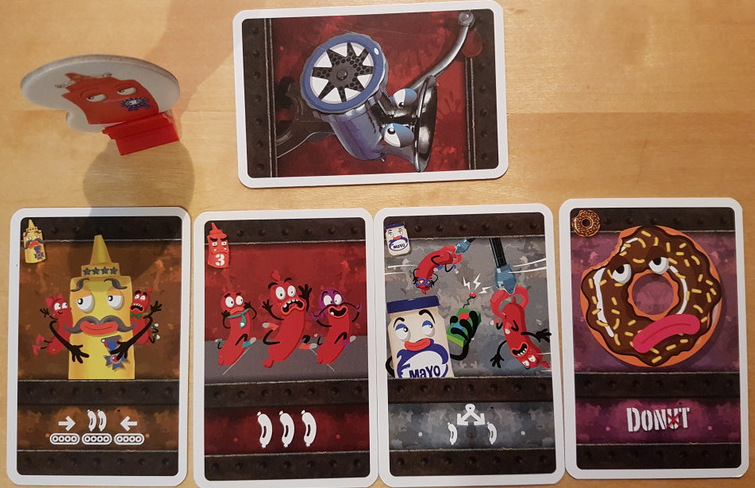Wurst case scenario is a simple family card game for 2-6 players. It consists of 8 sausages in a stand, 8 corresponding sausage identity cards, 38 action cards, conveyor belt cards and some sabotage tokens. Each player obtains the identity of one (for 5-6 players) or two (for 2-4 players) sausages and each has the mission to survive as the last “wurst” standing. ![]() The players keep their sausage identity secret to the others. Three action cards are dealt to each player. Most of the action cards yield the possibility to move one or more sausages in or against the direction of the conveyor belt or modify the conveyor belt itself (add or remove elements). Some action cards allow to sabotage the conveyor belt with power outage or sticky jam or slippery banana peel. These events let the affected sausages either stay where they are or transport them one field closer towards the meat chopper. The action cards are categorized into three level of possible executions: actions that must be executed completely (Mayor “Must-ard” is depicted on these cards), actions that can be also partially executed (Mister Ketchup is depicted) or actions that may or may not executed at all (Lady “May-onnaise” is depicted). Sausages, mustard, ketchup and mayonnaise – this sounds like a funny and tasty game, especially for children. When it’s their turn, a player has to play one card from theirhand, carry out the possible action(s) of the card, discard it and draw a new card. Simple as that. One may decide not to play a card and thus pass his turn, he then must discard all cards of his hand and draw 3 new cards. In the course of the game hand cards can be stolen (action card), leaving the victim with only 2 cards which is quite a restriction. Thus discarding all hand cards and draw 3 new ones is the only possibility to get rid of this restriction. Having a hand of only three cards may be seen by experienced gamers as a limitation in itself, but this is a family card game to be played with children at an age of 8 years. ![]() Since each player tries to protect their own sausages and push the others closer to the meat chopper, the harder it is to predict what will happen the more players participate in the game. Right after the start of the game it is part of the fun to guess which sausages belong to which player, with the only hints being the action cards carried out and seeing which sausages benefit from it. It works quite well for a smaller round of 2-4 players with children participating, because they obtain 2 sausage identities and thus have a higher probability to survive with at least one sausage. The disadvantage of a larger round with each player having only one sausage identity, is that for one player the game might end too early, which can be a bit frustrating for the unexperienced new young gamer apprentice. However, a game lasts about 15 minutes, so there is always the possibility to taste the sweet revenge in a next round. | ||